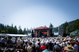 Orbán Viktor miniszterelnök (k) a 34. Bálványosi Nyári Szabadegyetem és Diáktáborban tartott politikai fórumon az erdélyi Tusnádfürdõn 2025. július 26-án. Mellette Tõkés László, az Erdélyi Magyar Nemzeti Tanács (EMNT) elnöke (j) és Németh Zsolt, az Országgyûlés külügyi bizottságának elnöke.