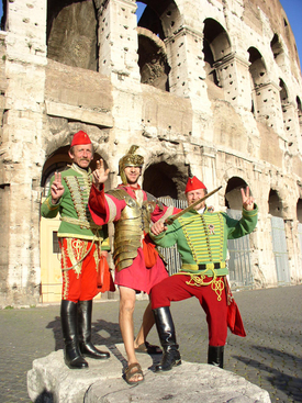 A Kolosszeum mellett Rómában, miután a középen álló idegenforgalmi hagyományőrző centurio belátta, hogy pénzt kérni ezért a fényképért neki csak annyira lehet indokolt, mint Gáboréknak. Így egy kurta viszály után kihozták a dolgot nullszaldóra. Balról jobbra: Abonyi Gábor, a centurio, akinek nevét nem ismerem és Pajer Márton.