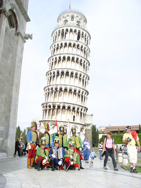 A képen az olasz építészet világhírű építménye, a pisai ferde torony előtt, a 2. évezred legsikeresebb könnyűlovasságának, a magyar huszárságnak a hagyományőrzői láthatóak.