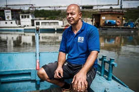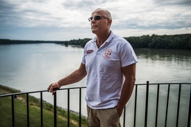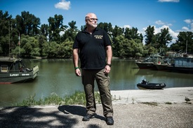 Vígh János, a Szökőár Kft. tulajdonos-ügyvezetője, ipari búvároktató és vizsgabiztos a cég budapesti bázisán a Ráckevei-Duna partján 2019. július 15-én.