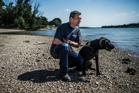 Szávity József zászlós, a BRFK bűnügyi technikai osztályának kutyavezetője Adél nevű kutyájával a dunakeszi Duna-parton 2019. július 3-án.