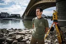 Simon Péter geodéta, a HM Zrínyi Nonprofit Kft. felmérő mérnöke a Margit híd budai hídfőjénél 2019. július 23-án.