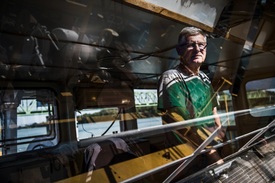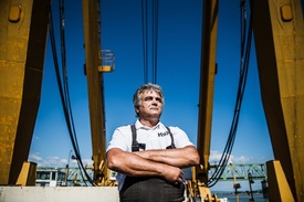 Pusztai László, a Clark Ádám daruhajó úszómunkagép-vezetője a hajón a Duna komáromi szakaszán 2019. július 10-én.