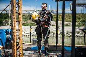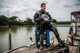 Bánki Frigyes, a Szökőár Kft. ipari búvára Budapesten, a Petrol-öbölben 2019. július 9-én.