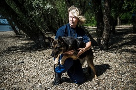 Stein Mária alezredes, a BRFK bűnügyi kutyavezetői alosztály munkatársa bűnügyi speciális holttestkereső kutyájával, Liluval a dunakeszi Duna-parton 2019. július 3-án.