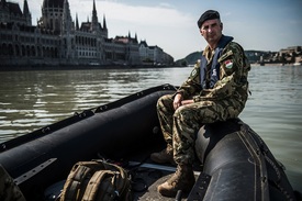 Tarlós Vince törzsőrmester, a Magyar Honvédség 1. Honvéd Tűzszerész és Hadihajós Ezred katonája egy gumicsónakon, a Duna belvárosi szakaszán a Parlament előtt 2019. július 3-án.