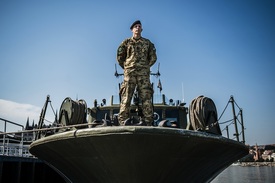 Koch Norbert főhadnagy, a Magyar Honvédség 1. Honvéd Tűzszerész és Hadihajós Ezred Hadihajós Alosztály megbízott parancsnoka a Dunaújváros aknamentesítő hajón, a Duna belvárosi szakaszán a Parlament előtt 2019. július 3-án.