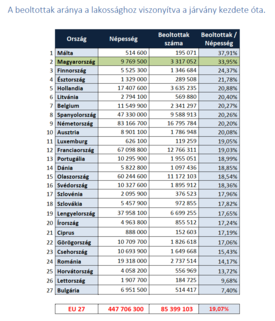 Ha azt nézzük, hogy hányan kapták meg a második oltást is, akkor Magyarországon 14,5 százalékot kapunk, míg az EU átlaga csak 6,94 százalék.