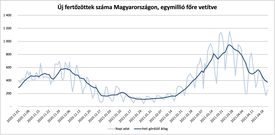 Jól látszik, hogy a harmadik hullám csúcspontja március 26-án volt Magyarországon. Azóta folyamatosan csökken az új esetek száma. Egy hónap alatt nagyjából a harmadára esett az új esetek száma. A harmadik hullám csúcsához képest 70 százalékkal csökkent az új fertőzöttek száma.