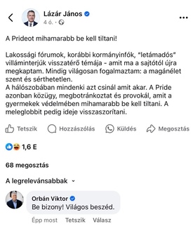„A Pride-ot mihamarabb be kell tiltani! – szögezte le Facebook-oldalán Lázár János. „Lakossági fórumok, korábbi kormányinfók, »letámadós« villáminterjúk visszatérő témája – amit ma a sajtótól újra megkaptam. Mindig világosan fogalmaztam: a magánélet szent és sérthetetlen. A hálószobában mindenki azt csinál amit akar. A Pride azonban közügy, megbotránkoztat és provokál, amit a gyermekek védelmében mihamarabb be kell tiltani. A meleglobbit pedig ideje visszaszorítani” – tette hozzá az építési és közlekedési miniszter.