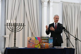 Soltész Miklós, a Miniszterelnökség egyházi és nemzetiségi kapcsolatokért felelős államtitkára beszédet mond a zsidó hittankönyvsorozat újabb, az ötödik osztályosoknak szóló kötetének bemutatóján a Szolnoki Galériában 2021. december 1-jén