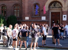 Trux elvtársai ma néhányan megjelentek tüntetni a bíróság közelében a Bihari János utca és a Markó utca sarkán, ahol transzparensek mögé és esernyők alá bújtak, a tárgyalás alatt pedig harsány kommunista mozgalmi zeneszámokkal szórakoztatták a környékbeli épületek lakóit. A tárgyalóteremben helyet foglaló elvtársaik sállal, maszkkal takarták el arcukat, egyikük egy szivárványszínű legyező mögé rejtőzve fényképezte a hallgatóság nem antifa részét – amihez egyébként a tárgyalási rendtartás szerint nem volt joga. A sajtó képviselőinek viszont jogukban áll fotókat készíteni, ezt izgatott gesztikulálással nehezményezte az egyik német kommunista fiatalember – hiába. Ráadásul a sapkákat, sálakat is kénytelenek voltak levenni Sós József bíró utasítására. A bíróság előtt a Hatvannégy Vármegye Ifjúsági Mozgalom, a Légió Hungária és a Betyársereg tagjai adták az antifasiszták tudtára, hogy nemkívánatosak Magyarországon.