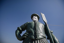 Elhagyatott a Balaton-part legrégebbi és egyik legnépszerűbb üdülőhelye, Balatonfüred is. Még a Tagore sétány nevezetességei, a Halász és Révész bronzszobrok is arcmaszkot viselnek, közöttük Maradj otthon! molinót húz feszesre a hullámokat korbácsoló szél. A balatonfürediek komolyan veszik a korlátozásokat, a sugárzó napsütés ellenére a hajókikötőben jórészt csak építőmunkásokat látni. A járványra való tekintettel most mi sem simogatjuk meg a szobrok fényes csizmáját, ami a helyi hiedelem szerint a visszatérés záloga lenne, így csak lélekben búcsúzunk a magyar tengertől.