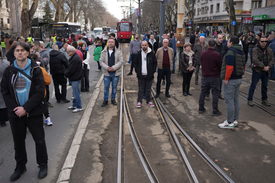 Kormányellenes tüntetõk útlezárással tiltakoznak Belgrádban 2025. január 29-én.
