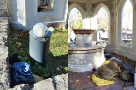 Vagy netalán az ide elhelyezett kukák is szimbolikusak, azt üzenik, hogy a múlt egy szeméttelep? Lehet, hogy jobban járna mindenki, ha nem csak a szakrális műemlékeinket tisztelnénk meg azzal, hogy nem engedjük át az emberi mocsoknak, hanem a kukákat is eltüntetjük innen, mert ez olyan, mintha a templomban a szenteltvíztartó mellett lenne egy szelektív hulladékgyűjtő is. Egyszerűen nem fér össze a két dolog.