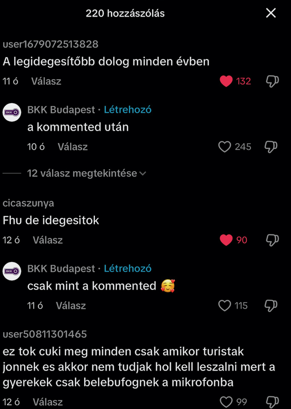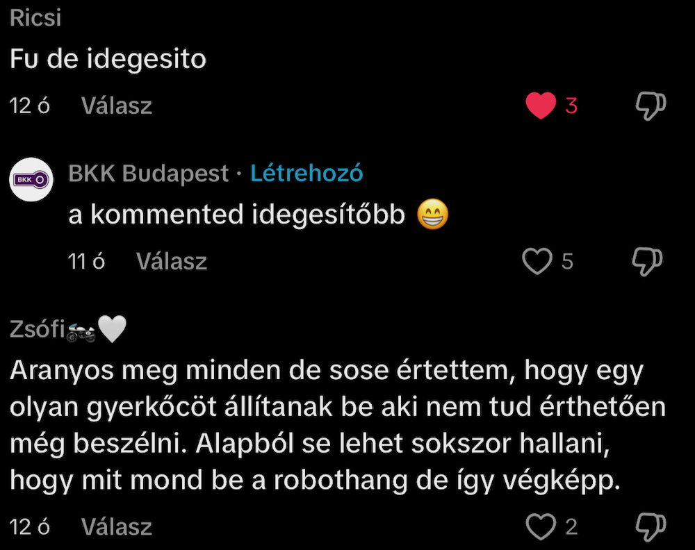 Több kommentelő idegesítőnek titulálta a gyereknapi bemondásokat. Ezekre a BKK gyerekes módon annyit felelt, hogy az illető kommentje idegesítőbb. (Aki mondja másra, az mondja magára – ez Budapest közlekedésszervezője közösségimédia-felelős munkatársának gondolkodása. Tudjuk be a gyereknap közeledtének…)