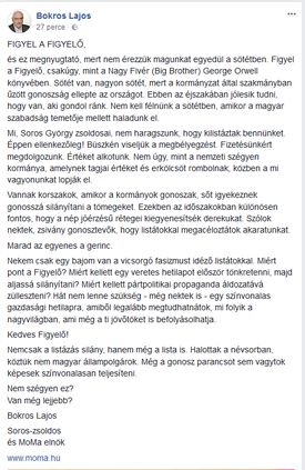 A szabad szemmel észrevehetetlen Modern Magyarországért Mozgalom elnöke, Bokros Lajos is megszólalt az ügyben. FIGYEL A FIGYELŐ című írásában – miután a Big Brothert (Nagy Testvért) véletlenül Nagy Fivérnek fordítja – mindenkit megnyugtat, hogy nem haragszik a listázás miatt, és büszkén viseli a Soros zsoldosa címkét. A kormány gonoszságáról szóló értekezését aláírásával és két legfontosabb titulusával (MoMa-elnök, Soros-zsoldos) zárja.