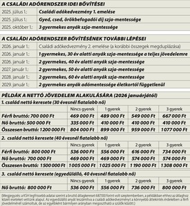 A családi adó- és járulékkedvezmény 2026. január 1-jétől ismét emelkedni fog: ez lesz a második lépés a duplázáshoz, miután 2025 júliusában már a korábbi másfélszeresére emelkedtek a lehetséges összegek. Ez azt jelenti, hogy jövő januártól egy gyermek után havi 20 ezer, két gyermek után 80 ezer, három vagy több gyermek után pedig gyermekenként havi 66 ezer forint kedvezményt lehet érvényesíteni, vagyis három gyermek esetén havonta 198 ezer, négynél pedig 264 ezer (!) forinttal lehet több egy család nettó keresete.