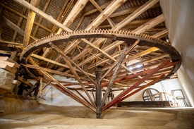 Az 1800-as évek első felében épült, Mekényesről idetelepített szárazmalom járgánykerekét egykor lovak vontatták, de állati erő híján olykor embereket is befogtak a munkára. Mivel a hatalmas szerkezet mozgatását a látogatók bátran kipróbálhatják, mi is teszünk egy kísérletet. A 9 méter átmérőjű masina mozgatásához három felnőtt fizikai erejére van szükség…