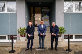Czomba Sándor, a Gazdaságfejlesztési Minisztérium foglalkoztatáspolitikáért felelős államtitkára (k), Cser-Palkovics András polgármester (b) és Sinkó Ottó, a Videoton Holding Zrt. társ-vezérigazgatója (j) a székesfehérvári Videoton Holding Zrt. új munkásszállójának avatásán 2023. április 18-án