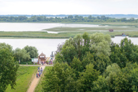 További sétánk során az igazgatóhelyettestől megtudjuk, hogy a poroszlói látogatóközpont 2600 m²-es, felszálló madarat mintázó főépülete négy szinten nyújt szolgáltatásokat. A 28 méteres magasságban levő panorámakilátóból pillantást vethetünk a főépületet körül­ölelő 7 hektáros szabadidőparkra. Amerre a szem ellát, a szigetekkel és nádasokkal szabdalt poroszlói medencét csodálhatjuk. A főépületet elhagyva elballagunk az „ismerd meg a természetet” mottó jegyében kialakított állatparkba, ahol a vendégek közvetlen kapcsolatba kerülhetnek például juhokkal és dámszarvasokkal is. Bambi a gyerekek kezéből is bátran elfogadja a frissen szedett füvet, és türelmesen hagyja, hogy megsimogassuk. A szabadidőparkban több más állatfaj mellett meg lehet csodálni a kormoránokat és a pelikánokat is, de vannak játszóterek és a XIX. századi tiszai életet bemutató skanzen is. Az ökocentrum kikötőjéből GPS-navigációval ellátott hajókkal önállóan is lehet csónakázni, emellett rendszeres kishajós járatok is indulnak a környező szigetek élővilágának megismerésére. A komplexum akár 2-3 napos itt tartózkodás alatt is bőven kínál látnivalókat. Az látogatóközpont, amely 2,2 milliárd forintos beruházással – ebből 1,9 milliárd forint európai uniós támogatással – készült el, inspirálni szeretné a látogatókat arra is, hogy kedvet kapjanak a Tisza-völgy többi településének meglátogatására.
