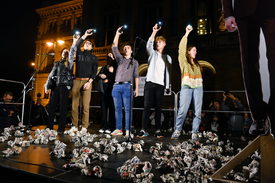 Budapest, 2022. október 14. Résztvevõk a Diákok a tanárokért Facebook-csoport Visszavágó – El a kezekkel a tanárainktól! elnevezésû demonstrációján a Belügyminisztérium Széchenyi István téri épületénél 2022. október 14-én.