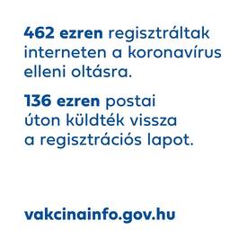 Dömötör Csaba Facebook-bejegyzésben közölte, eddig több mint 462 ezren jelezték igényüket, 136 ezer állampolgár pedig postai úton küldte vissza a regisztrációs lapot.Dömötör Csaba Facebook-oldalán közzétett bejegyzésében írta: tovább nőtt a koronavírus elleni oltásra regisztrálók száma. A hivatalos internetes oldalon már 462 ezren jelezték igényüket, 136 ezer állampolgár pedig postai úton küldte vissza a regisztrációs lapot.