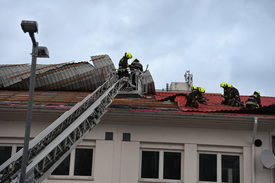 Tűzoltók dolgoznak a főváros XX. kerületében, ahol egy felújítás alatt lévő üzlet tetejéről szakította le a lemezfedést a viharos szél 2022. január 17-én