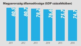 Egyenletes csökkenést mutatnak hazánk államadósságról szóló adatai. Az Eurostat számítása szerint a 2010-ben még a GDP 80,5 százalékára rúgó adósságállomány tavaly már 74,7 százalékig csökkent. A mérséklődés az elmúlt három évben rendre 1 százalékpont volt: két évvel korábban még 76,6, egy évvel korábban 75,7 százalék volt az adósság.