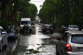 Autók haladnak a felhőszakadás után esővízzel elárasztott, letört faágakkal teli úton Budapesten, Wekerletelepen 2021. július 9-én