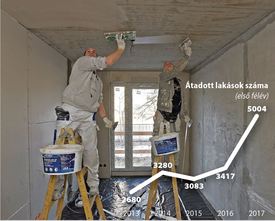 Az idei év első felében 5004 új lakás épült, 1587-tel – azaz 46,4 százalékkal több, mint 2016 első fél évében. A kiadott építési engedélyek és egyszerű bejelentések alapján építeni szándékozott lakások száma 19 823, 40,2 százalékkal magasabb, mint tavaly ilyenkor – derül ki a KSH adataiból. Budapesten nincs érdemi változás, ugyanakkor a megyei jogú városokban 38,3, a többi városban 81,1 százalékkal több lakást adtak át, a községekben pedig majdnem duplájára, 97,5 százalékkal nőtt az épített lakások száma. Az építők körében egyre nő a természetes személyek aránya, a tavalyi 46 százalékról immár 50 százalékra, s természetesen ezzel párhuzamosan csökken a vállalkozásoké.