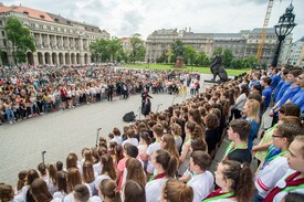 Az államtitkár köszöntője után több mint ötezer, a Kárpát-medencéből érkezett gyermek énekelte el közösen a Kézfogás című dalt, majd a Himnuszt.