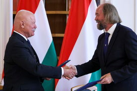 Csák János kulturális és innovációs miniszter (b) és Horváth Péter, a Nemzeti Pedagógus Kar elnöke kezet fog, miután együttműködési megállapodást írak alá a Kulturális és Innovációs Minisztérium (KIM) és a Nemzeti Pedagógus Kar között a minisztérium könyvtártermében 2023. augusztus 17-én