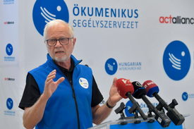 Lehel László, az Ökumenikus Segélyszervezet elnök-igazgatója beszédet mond a Finn Church Aid segélyszervezettel kötött együttműködési megállapodás aláírása alkalmából tartott sajtótájékoztatón
