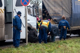 A Készenléti Rendőrség munkatársai sorra átvizsgálják az egy román állampolgár által vezetett, magyar rendszámú teherautóban talált ötvenkilenc migránst Kiskunhalas belterületén 2020. december 19-én