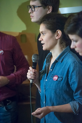 Pottyondi Edina, a Momentum mozgalom vidéki turnét szervező tagja azzal próbálta csitítani az elszabadulni látszó indulatokat, hogy szerinte a politikai elit felelőssége a teremben kialakult feszült hangulat.