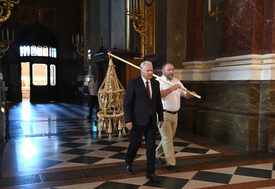 Elhelyezték a Szent István-bazilikában szerdán a Kárpát-medence Aratókoszorúját, amelyet az idén hajdúnánási gazdasszonyok fontak a Magyarok Kenyere – 15 millió búzaszem program részeként.