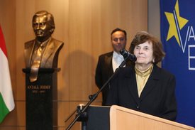 Az Európai Parlament által készített képen Antall József néhai miniszterelnök mellszobrának ünnepélyes leleplezésén beszél özvegye, Klára asszony az Európai Parlament brüsszeli épületének az egykori kormányfő nevét viselő szárnyában 2015. március 31-én