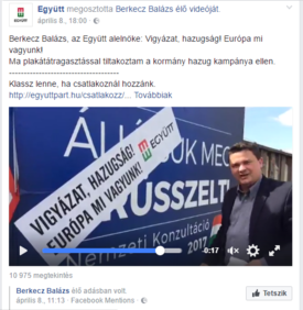 Bárány Balázs dicső tettét lemásolta az Együtt, Juhász Péter roppant színvonalas alakulata is. Berkecz Balázs, a párt alelnöke élő videóban jelentkezett be, ahol bemutatta saját hősies akcióját, amelynek keretein belül „Vigyázat, hazugság! Európa mi vagyunk! Együtt” feliratot helyezett el a kormány plakátjára.