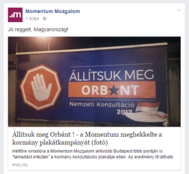 A meglévő ellenzéki pártoktól máskor oly nagyon különbözni vágyó Momentum is folytatja az MSZP és Együtt által megkezdett utat, ők is plakátokat alakítanak át. Hétfő reggel büszkén osztotta meg a párt Facebook-oldalán a hvg.hu cikkét, amelyben az szerepel: „Hétfőre virradóra a Momentum Mozgalom aktivistái Budapest több pontján is »támadást intéztek« a kormány konzultációs plakátjai ellen.” Mivel a párt megosztotta a cikket, láthatóan nem is tagadják tettüket. A plakátátragasztás híre a Momentum híveinél sem aratott osztatlan sikert. Idézzünk egy kommentet: