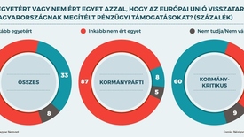 Arra a kérdésre, egyetértenek-e azzal, hogy az Európai Unió visszatartja a Magyarországnak megítélt pénzügyi támogatásokat, a magyar választók döntő többsége nemmel válaszolt. Csak egyharmaduk, 33 százalék jelezte, hogy egyetért a brüsszeli eljárással.