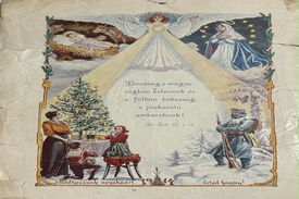 A képeslap hátoldalán található szöveg szerint a lapot a katolikus egyház 1848-ban alakult Szent István Társulata adta ki, amely ingyen terjesztett kiadványaival – köztük több mint egymillió imafüzettel – segítséget nyújtott mind a harcoló, mind a kaszárnyákban várakozó katonáknak, illetve a hadbavonultak hozzátartozóinak. Hogy valamelyest enyhítse a karácsony előtt szétszakított családok fájdalmát és egy kis ünnepi hangulatot vigyen a lövészárkokba, a szervezet 1914 decemberében a budapesti nőegyletekkel és Katolikus Karitásszal összefogva “szeretetdobozt” álított össze a fronton harcoló katonák számára.