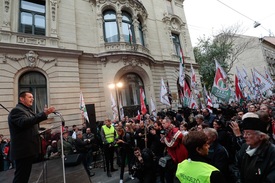 A Jobbik elnöke arról beszélt nemzetiszínű és pártzászlókat, valamint árpádsávos lobogót magasba emelő, általa több ezresnek mondott közönsége előtt: a pártot ért „minden ocsmány támadás” ellenére „többször annyian vagyunk, mint a választás idején, erőnk van és erőt mutatunk”.