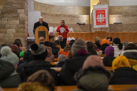 Écsy Gábor, a karitász országos igazgatója arról beszélt: az otthonukat elhagyni kényszerülő családokat a Katolikus Karitász sokféle módon támogatta az elmúlt időszakban, az otthon melegét azonban nem pótolhatták. A karácsonyi ünnepséggel éppen ez a céljuk. A családoknak szánt ajándékokkal „képletesen ünnepi asztalaink mellé szeretnénk hívni a jelenlévőket”. Az ajándékcsomagokba tett bejglivel és szaloncukorral, ami a magyar családok asztaláról nem hiányozhat a következő napokban, „szeretnénk kifejezni, hogy együtt érzünk ukrán barátainkkal” – mondta a segélyszervezet vezetője.