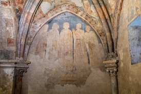 Bal kéz felé indulunk. A déli torony aljában meghúzódó sarokban freskótöredékek ötlenek szembe. A középkorban ez lehetett a templom leggazdagabban ékesített, legdíszesebb pontja.
