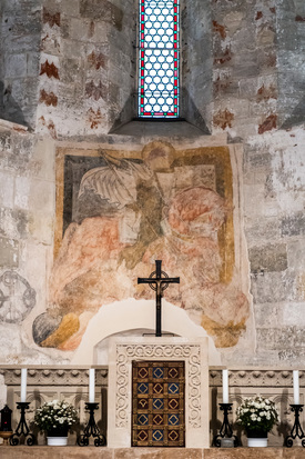 A szentély felé indulunk. Az oltár mögött látható ugyanis a templom másik különlegessége: a sárkányölőként is emlegetett Szent Györgyöt ábrázoló freskótöredék. A gonoszt szimbolizáló szörnyből ma már alig látszik valami, de a dárdájával szúró szent, valamint az őt hordozó ló jól kivehető.