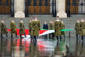 Félárbócon a nemzeti lobogó az Országház előtt