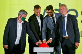 Pósán László, a térség fideszes országgyûlési képviselõje, Szijjártó Péter külgazdasági és külügyminiszter, Lukas Juranek, a Vitesco Technologies ügyvezetõje és Hans-Jürgen Braun, a Vitesco Technologies operatív részlegének vezetõ alelnöke (b-j) a Vitesco Technologies Hungary Kft. gyáravató ünnepségén Debrecenben 2021. június 24-én.