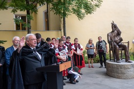 Kató Béla, az Erdélyi Református Egyházkerület püspöke beszédet mond Farkas Ádám Kossuth- és Munkácsy díjas szobrászművész (b) Kós Károly-szobrának avatásán a kolozsvári Kakasos templom előtt 2022. június 3-án