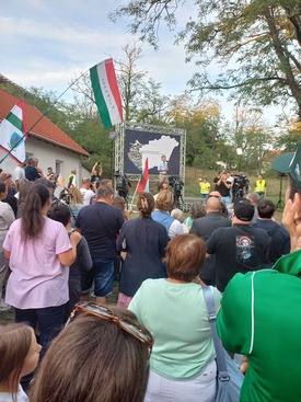Nyakam tekergetve konstatálom, habár a messiást derék termete okán még nem látom, hogy minden bizonnyal befutott a Tisza Cicerója, mert nicsak, egy tartó nélküli magyar zászló araszol egyenesen a színpadnak.